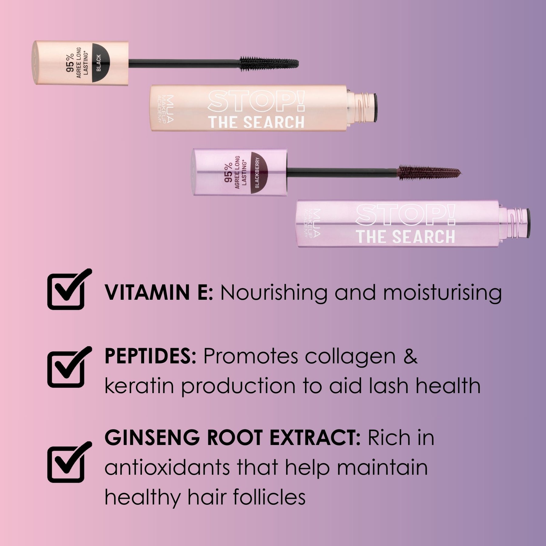 MUA STOP THE SEARCH MASCARA features a lightweight, long-lasting formula that lifts and lengthens lashes with precision.